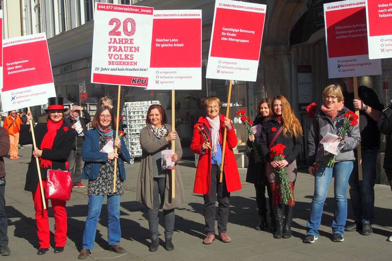 Unter dem Motto „20 Jahre und kein bisschen leise“ erinnerte die KPÖ an das Frauenvolksbegehren von 1997. 650.000 Österreicherinnen und Österreicher haben damals für mehr Frauenrechte unterschrieben. „Die Hälfte der Macht, des Einflusses und des Geldes den Frauen und die Hälfte der Hausarbeit und der Kindererziehung den Frauen!“, das war die Zielsetzung des Frauenvolksbegehrens. Aber viele der vor 20 Jahren erhobenen Forderungen wurden bis heute nicht umgesetzt.