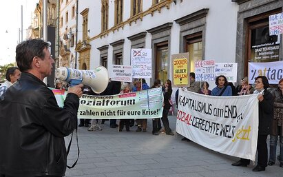 29-10-10 10.000 waren in Graz auf der Straße. 10.000 Grazerinnen und Grazer demonstrierten am 28. Oktober gegen das Belastungspaket der Regierung. Wir dokumentieren die Rede des kommunistischen Redners Robert Krotzer.