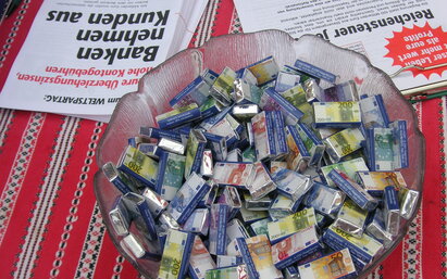 29-10-09 KPÖ Aktion zum Weltspartag. Mit Milliarden Euro wurden die österreichischen Banken vor dem Bankrott gerettet. Ein neues Belastungspaket der Regierung ist in Ausarbeitung, es soll diese Milliarden bei der Bevölkerung eintreiben. Bei den Kundinnen und Kunden bleiben die Banken geizig: Ausufernde und unübersichtliche Kontoführungsgebühren…
