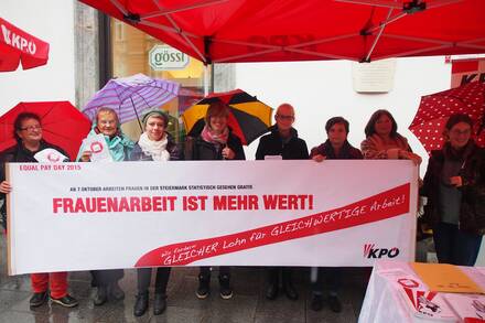 Am 7. Oktober 2015 ist „Equal Pay Day“ in der Steiermark (Österreich: 11. Oktober). Männer haben dann bereits jenes Einkommen erreicht, für welches Frauen noch bis zum 31. Dezember 2015 arbeiten müssen. Daran erinnerte die KPÖ mit Stadträtin Elke Kahr und Landtagsklubobfrau Claudia Klimt-Weithaler in einer Aktion in der Grazer Herrengasse, bei der in persönlichen Gesprächen und mit Flugblättern auf diesen Missstand hingewiesen wurde.