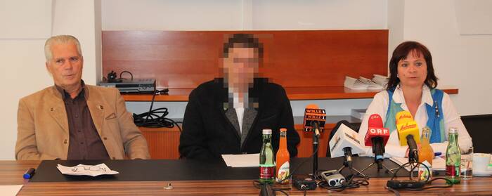 Peter Scheibengraf, Herr W. und Claudia Klimt-Weithaler bei der Pressekonferenz am 18. April 2012 zum Thema Spielsucht