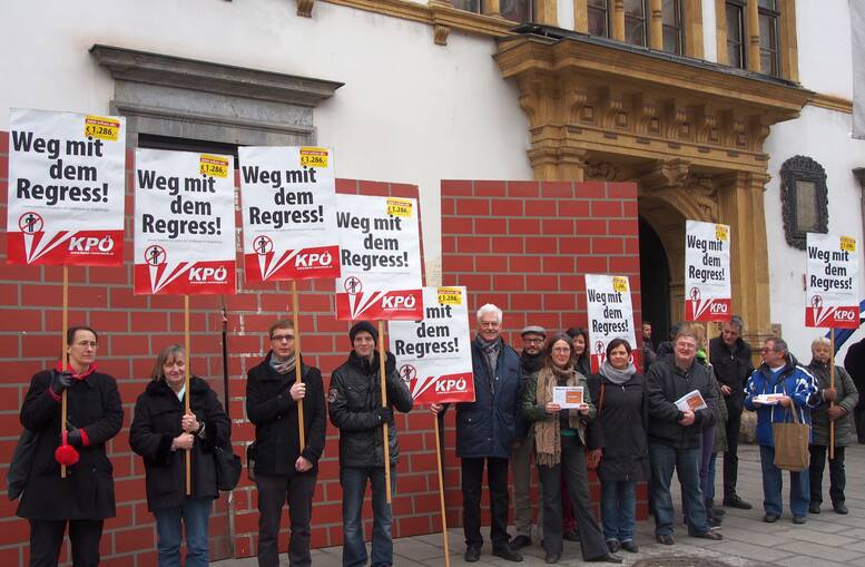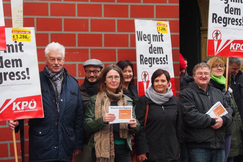 „Die Landesregierung kann sich nicht ewig einmauern. Der Regress muss endlich fallen“, bekräftigte KPÖ-Klubobfrau Claudia Klimt-Weithaler ihre Ablehnung dieser unsozialen Belastung. Gemeinsam mit der Grazer Wohnungsstadträtin Elke Kahr und LAbg. Werner Murgg machte sie mit Unterstützung vieler Aktivistinnen und Aktivisten erneut gegen diese unsoziale Belastung mobil. Die KPÖ erhielt für ihren Einsatz gegen den Regress großen Zuspruch von Passantinnen und Passanten.