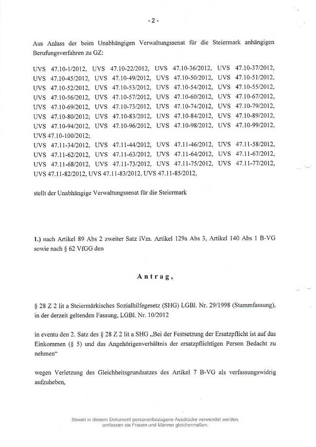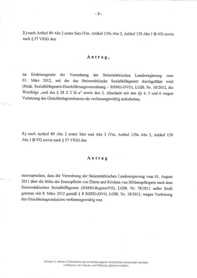 Konkret geht es um jene Bestimmungen im Steiermärkischen Sozialhilfegesetz, welche die Aufwandersatzpflicht festlegen. Dort wird kein Unterschied gemacht, ob Regresspflichtige noch weitere Unterhaltspflichten haben. Je nach familiärer Situation kann es deshalb zu einer groben Ungleichbehandlung der Betroffenen kommen.